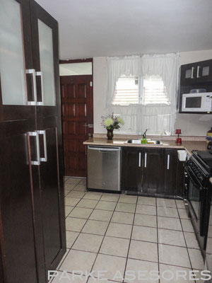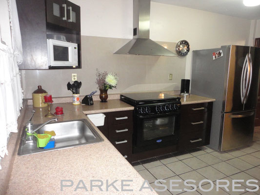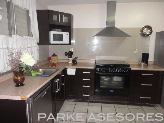- Cocina integral de madera, equipada con estufa, campana y lavavajillas
